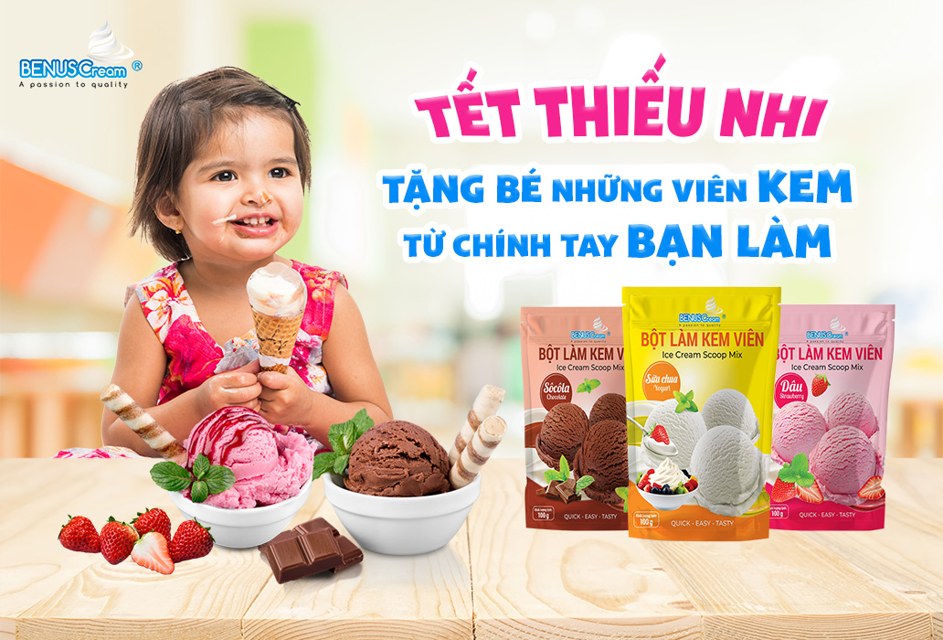 Trên đây là công thức làm kem viên đơn giản tại nhà với bột làm kem viên Benuscream. Chờ gì nữa mà không bắt tay vào làm ngay những loại kem viên hấp dẫn để làm quà cho bé vào ngày Quốc tế thiếu nhi ngay thôi.