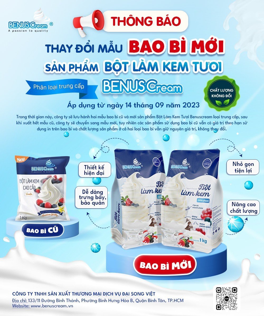 Công ty chúng tôi trân trọng thông báo đến Quý đối tác, đại lý, Quý khách hàng. Kể từ ngày 14/09/2023, công ty TNHH SX TM DV Đại Song Việt chính thức thay đổi mẫu bao bì sản phẩm Bột làm kem tươi Benuscream phân loại trung cấp.